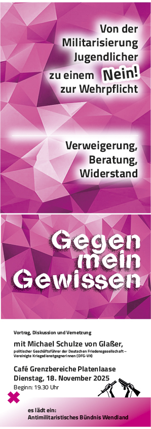 Der Abend dient aber auch der ganz praktischen Vernetzung von Menschen, die antimilitaristisch wirksam werden wollen im Wendland und darüber hinaus, und solchen, die interessiert sind, als Berater*innen bei der zukünftigen Kriegsdienstverweigerungsberatung zu helfen.